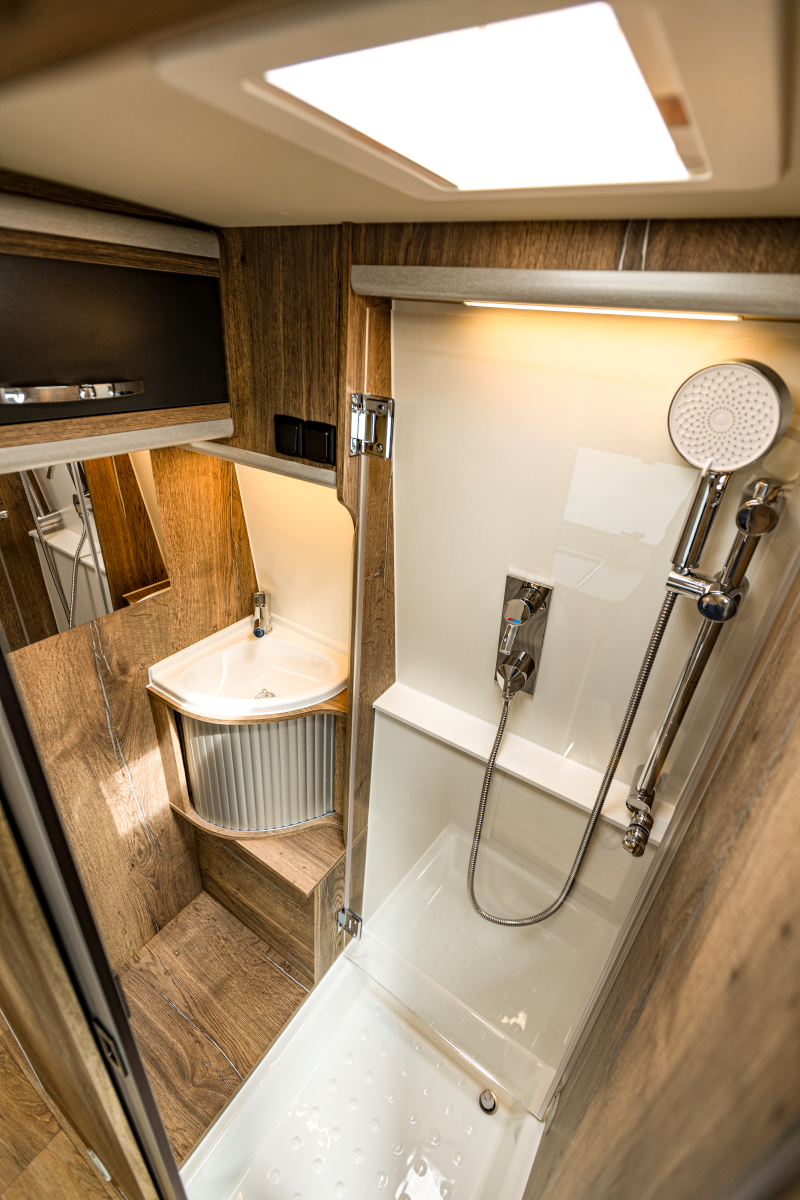 - EXTRA großes, patentiertes Komfort-Bad mit schwenkbarer Acrylglastüre zum Abtrennen der Dusche – robust, pflegeleicht und funktionell
