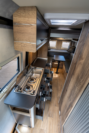 - Frischwassertank 80 Liter (+10 L Boiler) mit hochwertiger Wasserdruck-Ausgleichspumpe